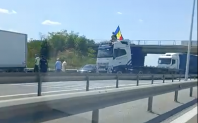Protest pe autostrada A1, între București și Pitești. Șoferul unui vehicul de mare tonaj flutură steagul României