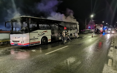 Un autocar cu peste 30 de oameni la bord a luat foc la marginea Sibiului