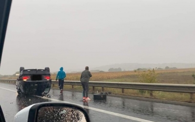 Accident pe autostradă. O mașină s-a răsturnat