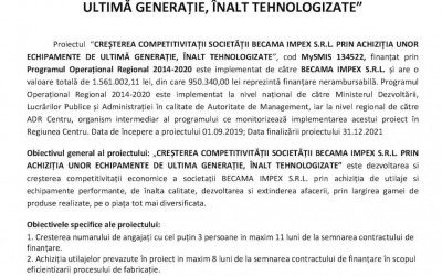 Anunț începere proiect „CREȘTEREA COMPETITIVITĂȚII SOCIETĂȚII BECAMA IMPEX S.R.L. PRIN ACHIZIȚIA UNOR ECHIPAMENTE DE ULTIMĂ GENERAȚIE, ÎNALT TEHNOLOGIZATE”