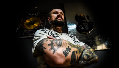 Chitara și cizmele faimosului chitarist Paul Stanley de la KISS, într-un salon de tatuaje din Sibiu