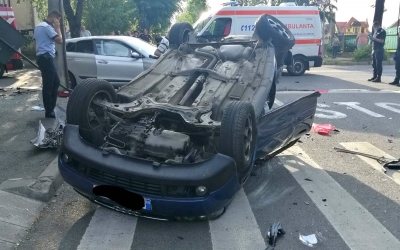 Foto | Mașină răsturnată pe bulevardul Victoriei: două persoane au fost duse la spital