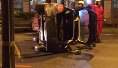 Mașină răsturnată pe Victoriei. Trei autovehicule implicate - Foto