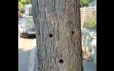 Copac găurit cu bormașina pe o stradă din Sibiu, să se usuce. În timpul codului roșu, când toată lumea caută umbra