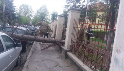 GALERIE FOTO-Trafic blocat complet pe Ștefan cel Mare. Vântul a doborât un copac peste două mașini