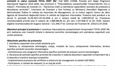 ANUNȚ DE PRESĂ. Anunț începere proiect ”Achiziție echipamente pentru extinderea activității în cadrul societății TOTAL DENT SRL”