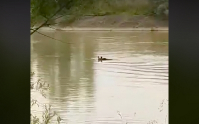 VIDEO-Urs filmat cum trece Oltul înot la Arpașu. Pescarii au încercat să-l alunge cu pietre, unii s-au speriat