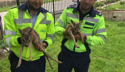 FOTO. Doi pui de căprioară rătăciți au fost salvați de doi polițiști care i-au dus înapoi în pădure, la mama lor