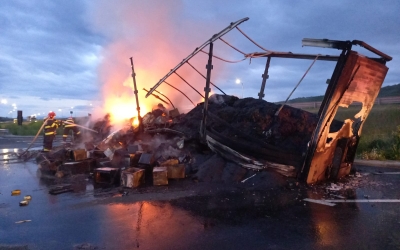FOTO-Remorca unui TIR distrusă complet noaptea trecută pe autostrada Sibiu-sebeș