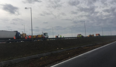 Trafic blocat pe A1. Un camion a intrat într-o mașină care aplica marcaje rutiere