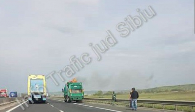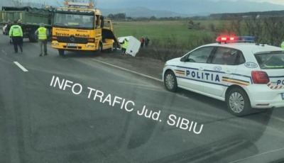 Un autovehicul care tracta o autoplatformă s-a răsturnat pe A1, la ieșirea din tunel, în zona Cristian