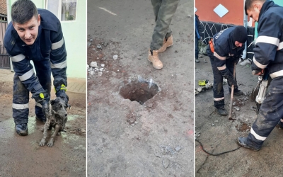 Cei de la ISU Sibiu au salvat un cățel blocat într-un canal pluvial