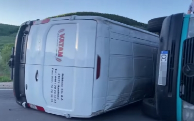 Un microbuz cu 6 persoane s-a răsturnat la coborârea de pe Hula Săcelului. Acesta tracta o platforma pe care se afla un alt microbuz