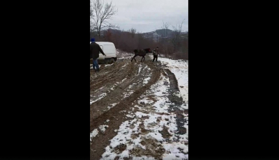 Se întâmplă în Sibiu. Mașină scoasă cu calul din mocirlă VIDEO