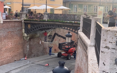 GALERIE FOTO-Au început să cadă bucăți din tencuiala Podului Minciunilor. Primăria a montat o plasă pentru protecția trecătorilor