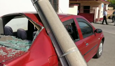 ACTUALIZARE-Stâlp doborât peste un autoturism. Șoferul autospecialei a primit avertizare scrisă