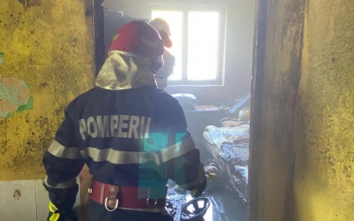 Incendiu într-un bloc din județ, pornit de la un calculator. Opt copii și doi adulți nu au putut ieși singuri, din cauza fumului dens