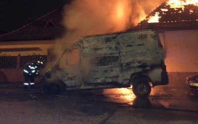 Microbuz incendiat, pe o stradă din Mediaș. Focul s-a extins la un depozit de fructe