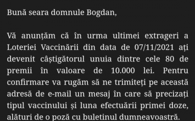 Atenție la e-mail-uri false, ce anunţă câştigarea de premii la Loteria Vaccinării