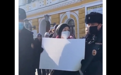 Video viral. O femeie cu o pancardă albă reținută de poliția rusă. Peste 250 de persoane au fost arestate