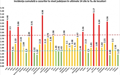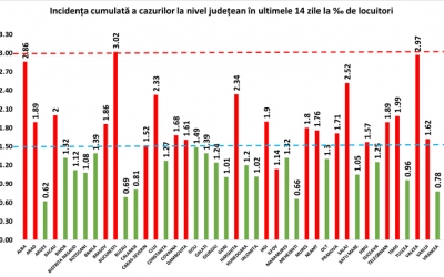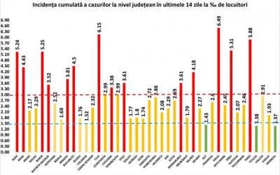 Rata infectării în fiecare localitate din județ. 12 localități au peste 7 la mia de locuitori