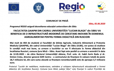 FACULTATEA ȘAIAPM DIN CADRUL UNIVERSITĂȚII ”LUCIAN BLAGA” din SIBIU VA BENEFICIA DE O INFRASTRUCTURĂ MODERNĂ DE CERCETARE-INOVARE ÎN DOMENIUL AGROALIMENTAR PENTRU FERMA DIDACTICĂ DIN RUSCIORI