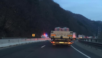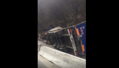 Sens de mers blocat pe Valea Oltului: un TIR s-a răsturnat în curbă
