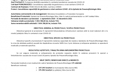 Comunicat de presă - Consolidarea capacității de gestionare a crizei sanitare COVID -19 la Spitalul de Pneumoftiziologie Sibiu Cod SMIS 139403