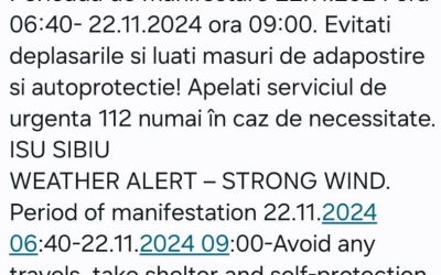 Cod roșu și cod portocaliu de vânt în județul Sibiu. O parte a populației a primit mesaj Ro-Alert
