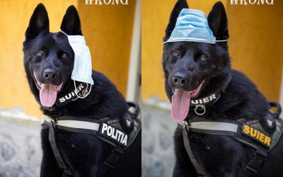 Fotografie virală. Câinele poliţist Şuier arată cum se poartă corect masca de protecţie