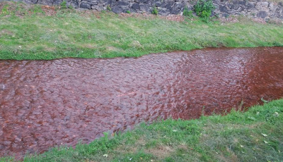 Pârâul Negru din Săliște a devenit roșu. Nimeni nu-și explică