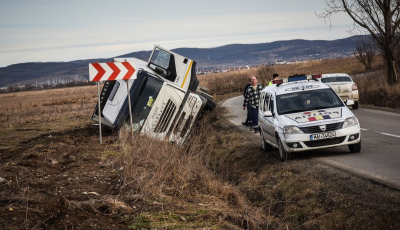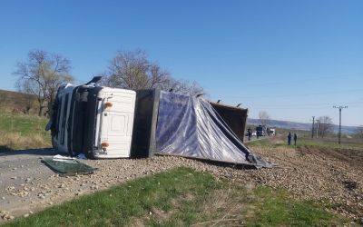 TIR răsturnat în drum spre Dobârca. Pasagerul a fost rănit