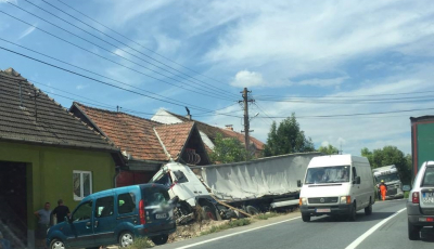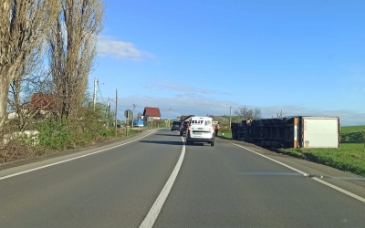 TIR răsturnat în Șura Mare. Poliția: Șoferul a fost salvat de centura de siguranță