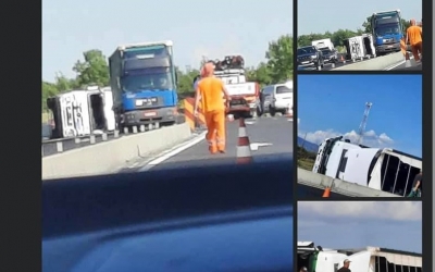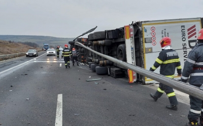 TIR răsturnat pe autostrada A1, în zona Săliște. Încurcă circulația pe ambele sensuri