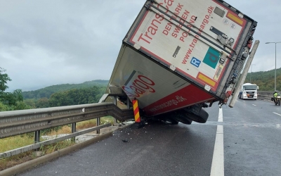 Accident spectaculos între Săliște și Sibiu: Un TIR aproape a căzut de pe autostradă
