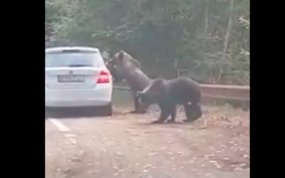 VIDEO Transfăgărășan: o turistă scoate capul din mașină la un urs și scapă la limită de un atac