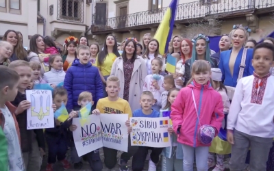 Peste 40 de ucraineni cântă diseară pentru pace, în Piața Mare. O parte din ei vin din orașul Vinița, bombardat de ruși acum două săptămâni