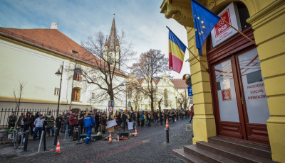A doua noapte de veghe în fața sediului PSD Sibiu. ”De fapt, noi asta facem: construim speranțe. Din orice”