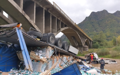 Foto Video Un șofer a murit după ce a căzut cu autocamionul de pe un viaduct, pe Valea Oltului