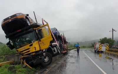 Probleme pe drumuri: TIR derapat la intrare pe Valea Oltului, inundații spre Brașov