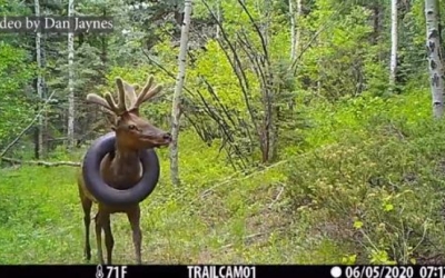 VIDEO Operațiune inedită de salvare a unui elan care avea o anvelopă blocată la gât de cel puțin doi ani