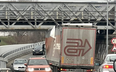 Șofer din Alba, amendat cu 990 de lei după ce a rămas blocat cu TIR-ul sub podul de pe Viitorului