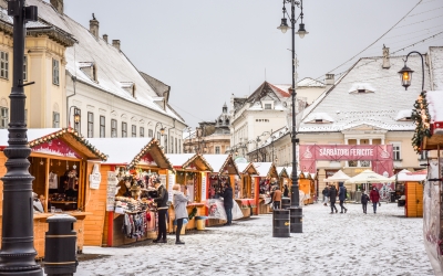 Imagini cu Târgul de Crăciun din Sibiu acoperit de zăpadă. „Ultimul detaliu de care târgul nostru avea nevoie pentru ca atmosfera să fie magică tocmai a fost rezolvat”