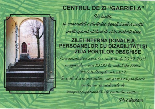 Întrucât Ziua Internațională a Persoanelor cu Dizabilități a fost celebrată la începutul acestei săptămâni, reprezentanții Centrului de Zi Gabriela din Sibiu îi invită pe doritori să facă o vizită centrului, pe toată durata zilei de mâine. În perioada 3 – 6 decembrie, centrele rezidențiale... Citeste mai mult