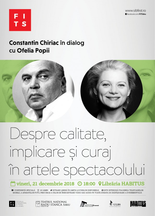 Ultima conferință specială FITS și TNRS din acest an o va aduce în fața publicului, alături de directorul general al Teatrului Național „Radu Stanca” Sibiu și președinte al FITS Constantin Chiriac, pe îndrăgita actriță a naționalului sibian, Ofelia Popii, într-un... Citeste mai mult