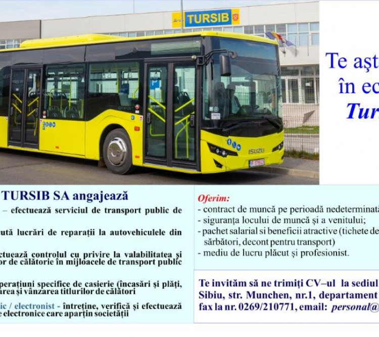 Compania de transport în comun a Sibiului, SC Tursib SA, face angajări în această perioadă recrutând pentru o serie de posturi disponibile.Conducător autobuz – efectuează serviciul de transport public de călătoriMecanic auto – efectuează lucrări de reparații la autovehiculele... Citeste mai mult