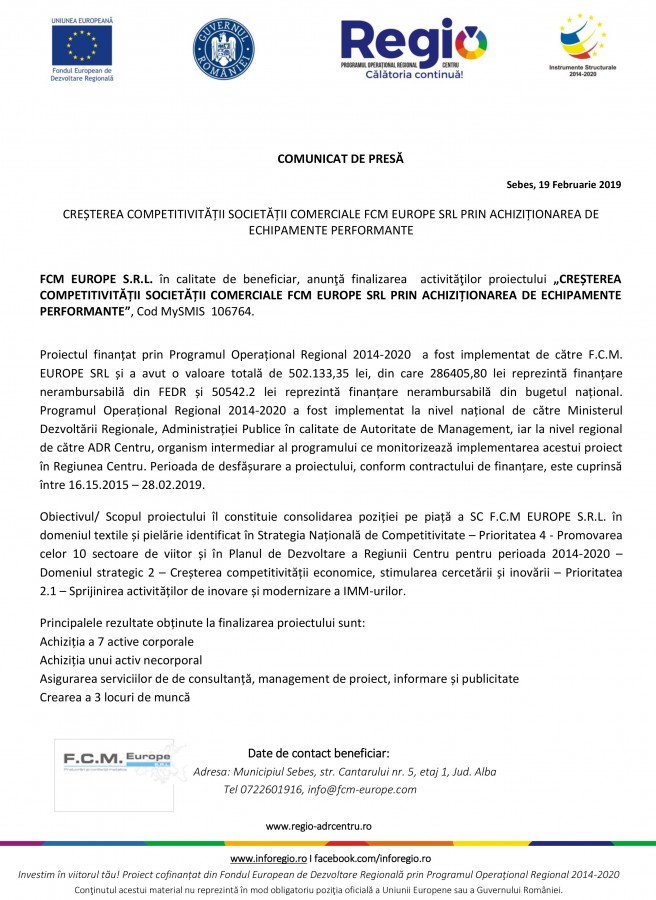 COMUNICAT DE PRESĂ Sebes, 19 Februarie 2019 FCM EUROPE S.R.L. în calitate de beneficiar, anunţă finalizarea activităţilor proiectului „CREȘTEREA COMPETITIVITĂȚII SOCIETĂȚII COMERCIALE FCM EUROPE SRL PRIN ACHIZIȚIONAREA DE ECHIPAMENTE PERFORMANTE”, Cod MySMIS 106764. Proiectul finanțat... Citeste mai mult