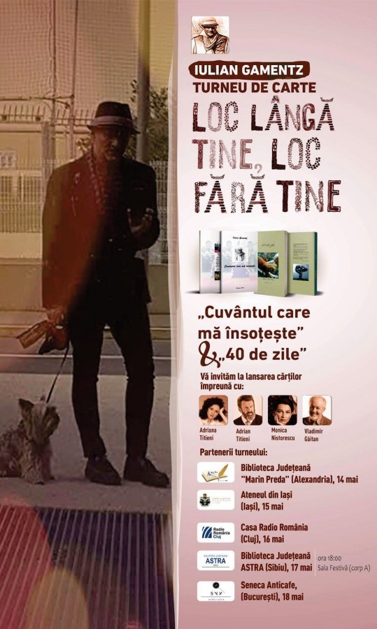 Scriitorul româno-canadian, Julian Gamentz, organizează Turneul de carte ”Loc lângă tine, loc fără tine”, în cinci orașe din România, în perioada 14 – 18 mai 2018.Julian Gamentz, autorul poemului manifest «La moartea Regelui meu drag al României», își va lansa... Citeste mai mult