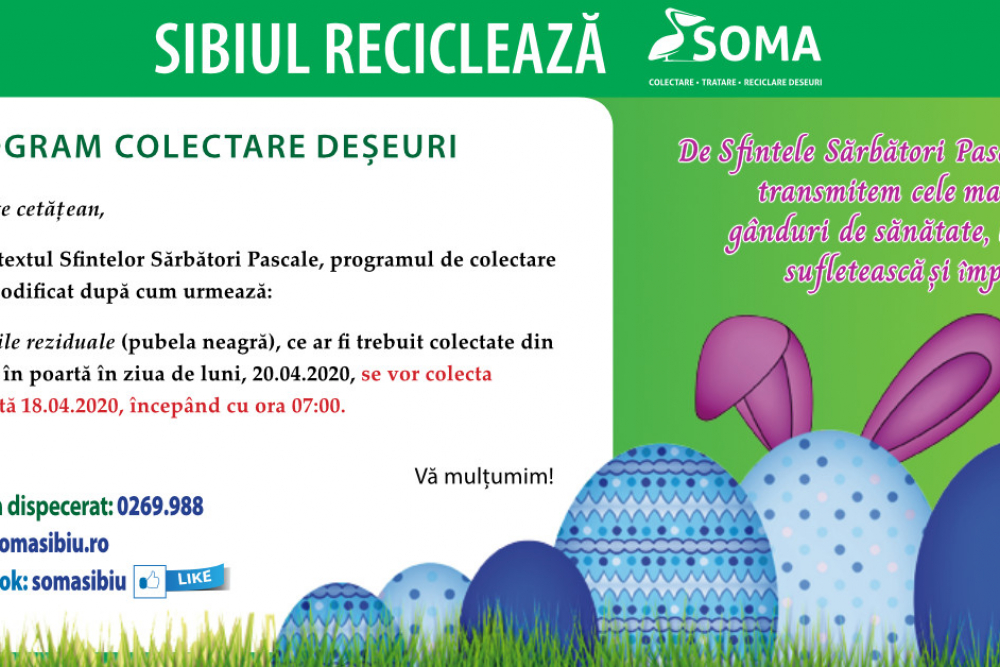 Compania de salubrizare Soma informează cetățenii Sibiului cum va decurge colectarea pubelelor de Paști.Astfel, deșeurile reziduale sau pubela neagră – cum mai sunt ele cunoscute, ce ar fi trebuit colectate în ziua de luni, 20 aprilie, se vor colecta sâmbătă, 18 aprilie, începând cu ora...