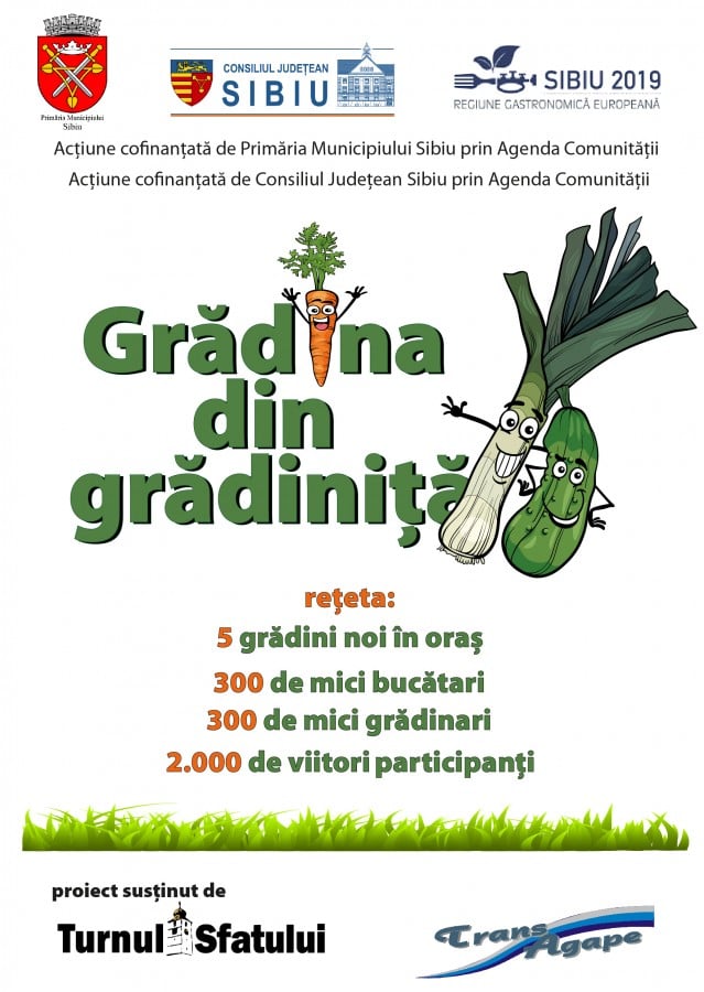 Au început lucrările la grădinile din grădinițeÎn cinci grădinițe din municipiul Sibiu a început amenajarea unor grădini de legume unde 300 de copiii vor învăța arta grădinăritului. Ei vor lucra alături de educatoare și personal specializat, ca niște mici grădinari. Demersul face parte din proiectului ”Grădina -